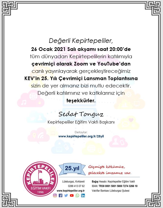 Kepirtepeliler Eğitim Vakfı (KEV), bugün 80 yılı aşkın bir tarihe sahip olan Kepirtepe’nin tüm mensuplarını tek bir çatı altında toplamak için uzun bir sürecin sonunda büyük emeklerle 26 Ocak 1996’da kuruldu. Bu yıl vakfımızın 25. yılını kutlamanın sevincini ve gururunu yaşıyoruz. Bu özel yılın resmi açılışını birlikte yapalım!