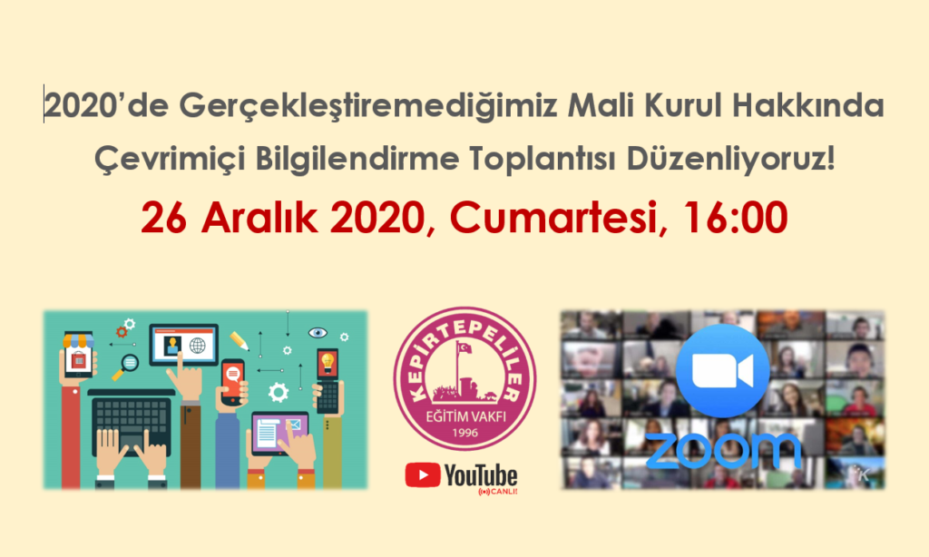 Vakıflar Genel Müdürlüğü tüm genel kurul toplantılarını pandemi nedeniyle 1 Mart 2021 tarihine kadar ertelediğinden vakıf senedimize göre mayıs-haziran aylarında gerçekleştirmemiz gereken Olağan Seçimsiz Mali Genel Kurul Toplantımızı gerçekleştiremedik. KEV olarak bu koşullar altında da şeffaflık ilkemiz gereği üyelerimizi ve Kepirtepe camiasını bilgilendirmeyi görev biliyoruz. Bu nedenle çevrimiçi bir toplantı gerçekleştiriyoruz. Bu çevrimiçi toplantı genel kurul yerine geçmeyecektir. Toplantının amacı yalnızca yıl bitmeden bilgilendirme yapmaktır. Tüm Kepirtepelilerin ve özellikle vakıf üyelerimizin katılımını rica ederiz.