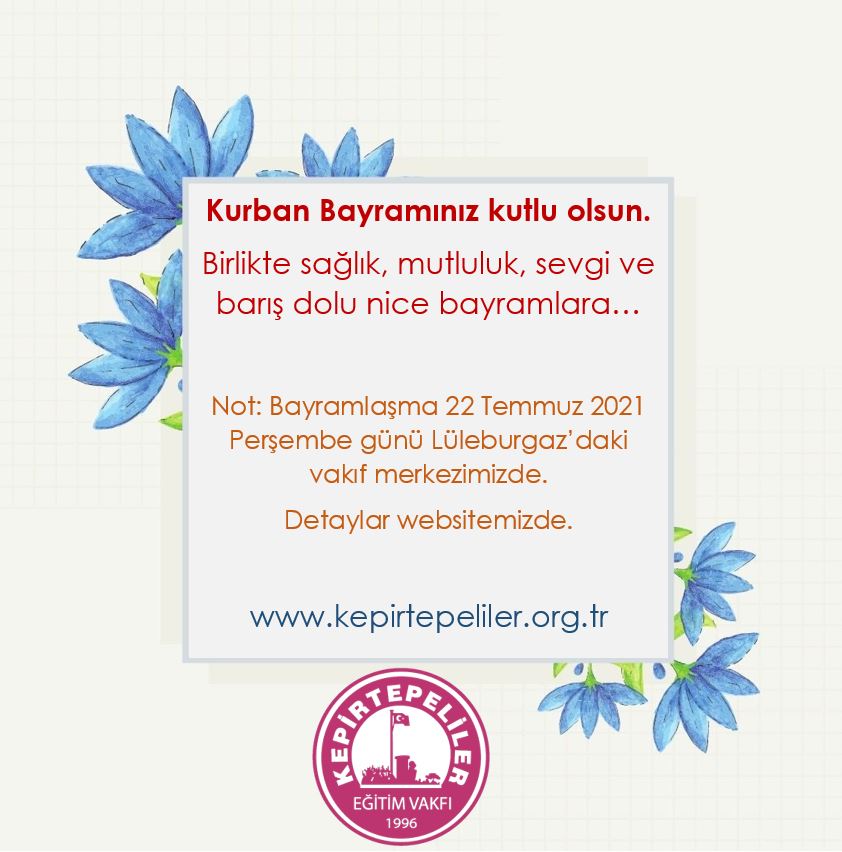 Bayramlaşma etkinliği, 22 Temmuz 2021 Perşembe günü, yani bayramın 3. günü, 11:00 – 15:00 saatleri arasında, Lüleburgaz’daki vakıf merkezimizde gerçekleştirilecektir. Vakıf merkezimizin adresi ve harita konumu için tıklayınız: https://www.kepirtepeliler.org.tr/iletisim