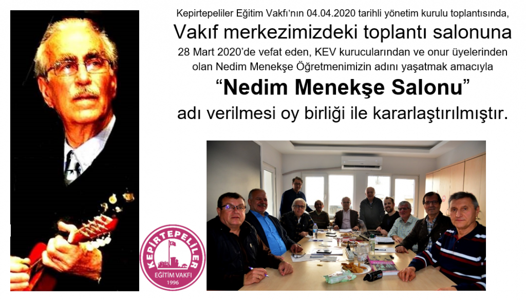 Kepirtepeliler Eğitim Vakfı’nın 04.04.2020 tarihli yönetim kurulu toplantısında, vakıf merkezimizdeki toplantı salonuna, 28 Mart 2020’de vefat eden, KEV kurucularından ve onur üyelerinden olan Nedim Menekşe Öğretmenimizin adını yaşatmak amacıyla “Nedim Menekşe Salonu” adı verilmesi oy birliği ile kararlaştırılmıştır.
